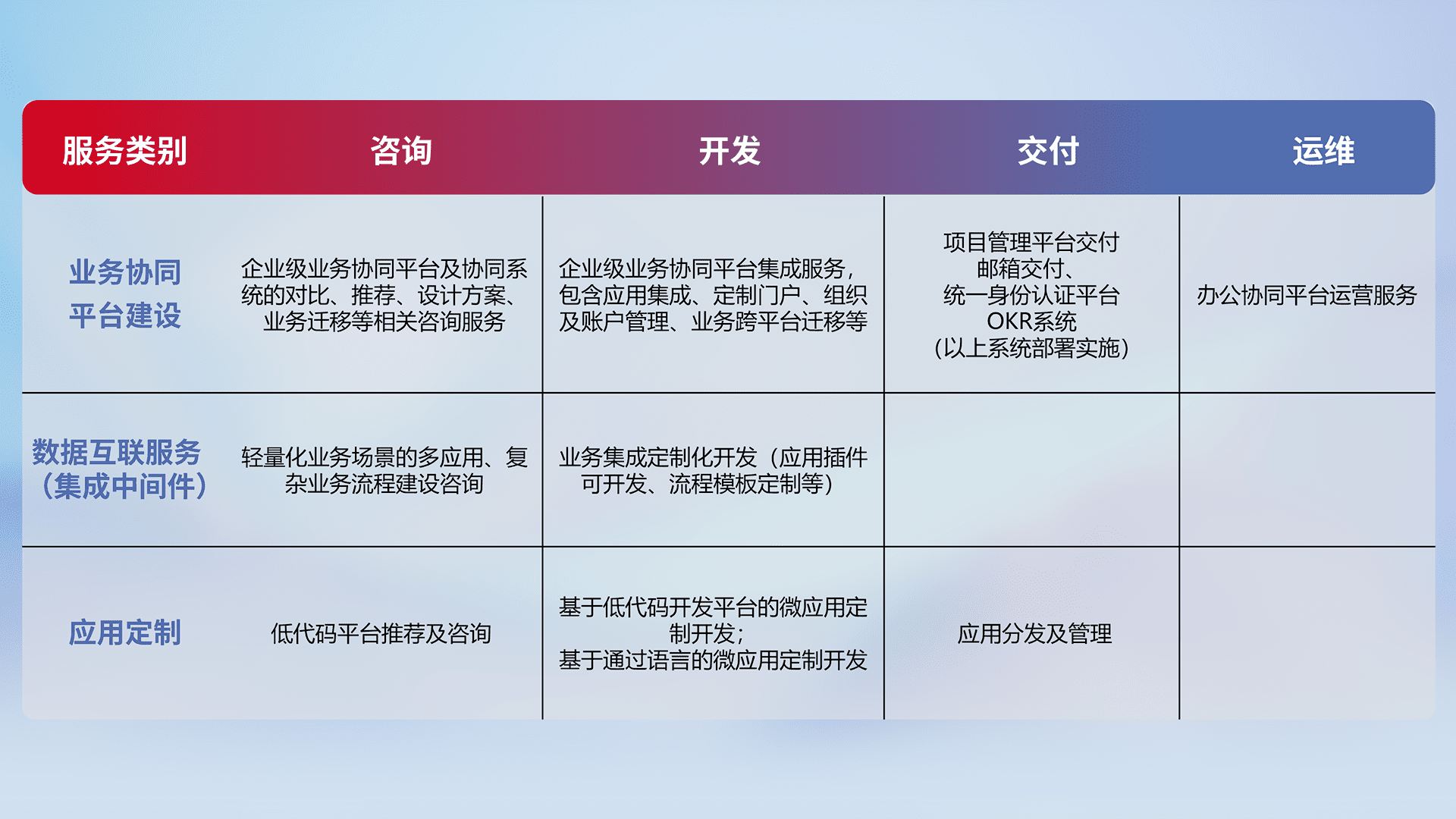 针对钉钉、、、企微、、、、IDaas等平台级产品提供产品的规划、、方案、、、、交付、、、、定制化开发等服务,,实现如统一协同办公、、智能客户服务、、、、混合会议管理、、、、智能数据查询、、等业务场景,,实现数字化转型。。。。