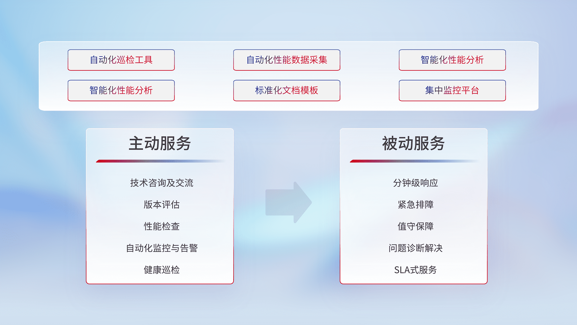智能化工具和标准化文档,,,保障服务质量,,,,提供主动服务(包含技术咨询、、、、版本评估、、、、性能检查、、自动化监控与告警、、、健康巡检)和被动服务包含(分钟级响应、、、紧急排障、、、值守保障、、、问题诊断解决、、、、SLA服务)。。。